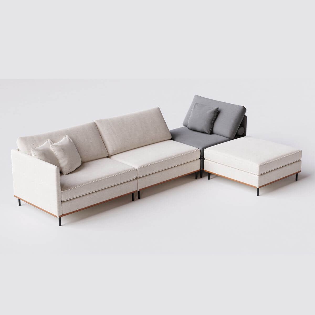 Largura total: 265x95 cm (2 mód 85 cm + 1 mód 95 cm + 1 Puff 95x95 cm + braços)